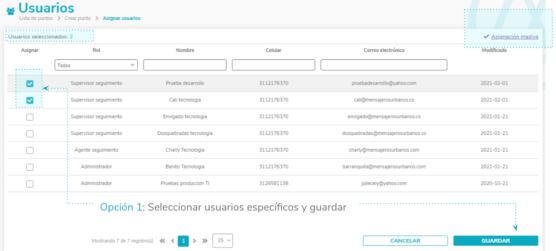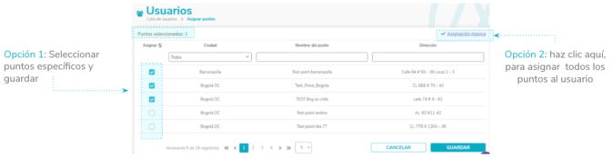 A crear el punto y dar clic en continuar, verás el listado de tus usuarios. Puedes asignar usuarios al punto de dos formas: